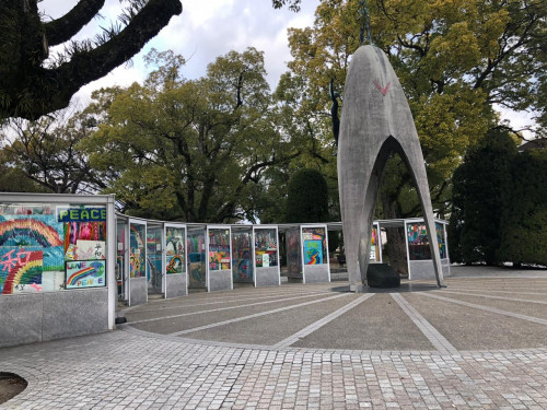 На презентации в ООН нам рассказывали, что со времен атомной бомбардировки осталось 56 (если не ошибаюсь) деревьев. До сих пор зелёных. Все они пронумерованы, создана карта, по которой можно найти каждое из них. Это общечеловеческая трагедия, не оставляющая равнодушными никого, а напоминанием о ней является вечный огонь, рядом с которым всегда живые цветы. Мы тоже почтили память погибших и возложили цветы.