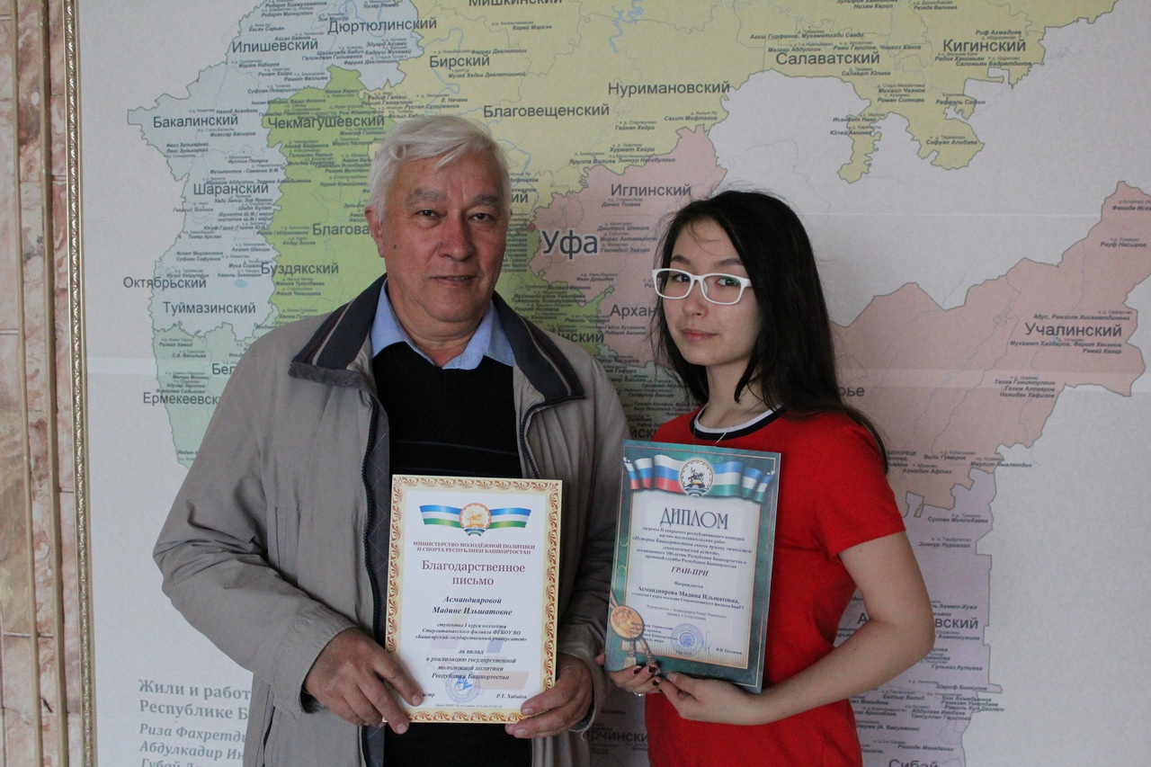 Студентка колледжа СФ БашГУ Мадина Асмандиярова выиграла республиканский конкурс шежере, посвященный 100-летию образования Башкортостана и государственной архивной службы республики. Мадина исследовала родословную Мусы Гатиятулловича Смакова, который внес немалый вклад в становление автономного Башкортостана. Над работой она трудилась несколько месяцев вместе с дедушкой Асмандияровым Ришатом Рашитовичем. Он искал информацию, посещал архивы. Собирала и анализировала Мадина.