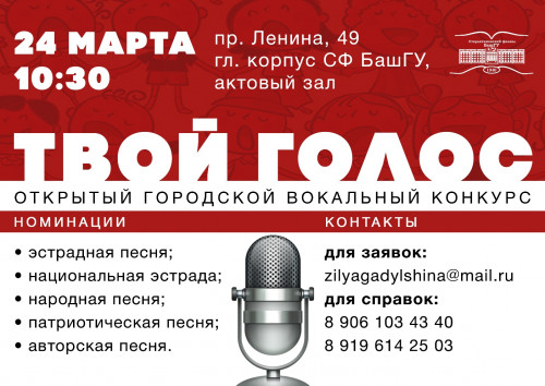 Организатором Открытого городского вокального конкурса «Твой голос» выступают Стерлитамакский филиал БашГУ, администрация ГО г. Стерлитамак. Информационный партнер - портал «Cityopen.Ru».