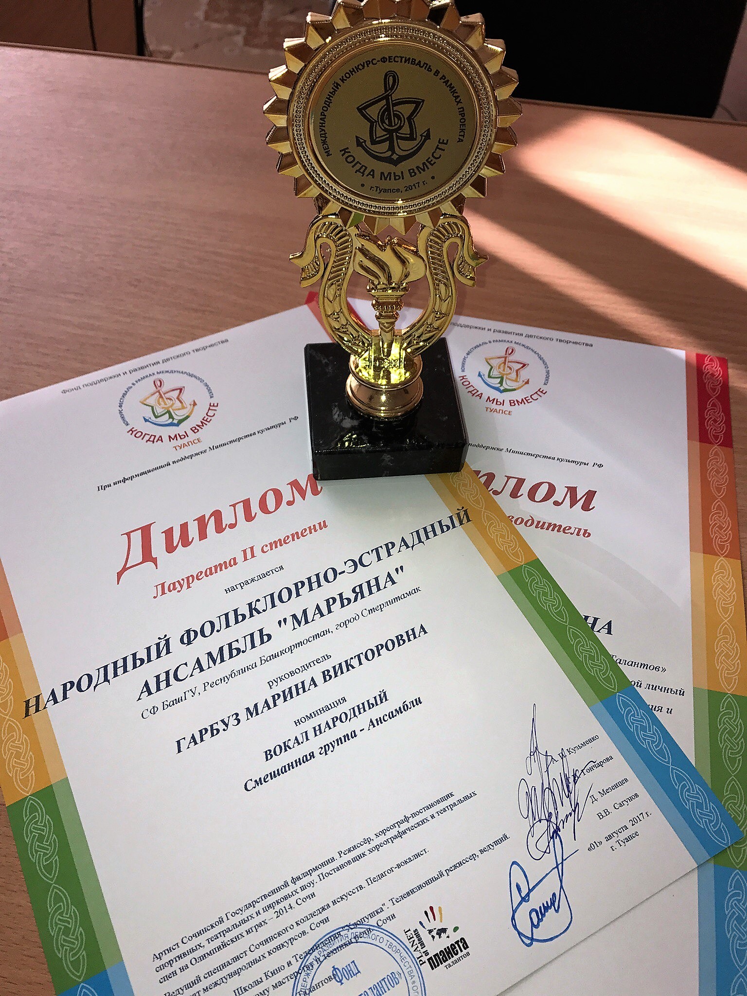 По итогам конкурса в номинации «Вокал народный» наш коллектив был признан лауреатом II степени, а руководитель ансамбля «Марьяна» Марина Викторовна Гарбуз получила диплом «Лучший руководитель».
