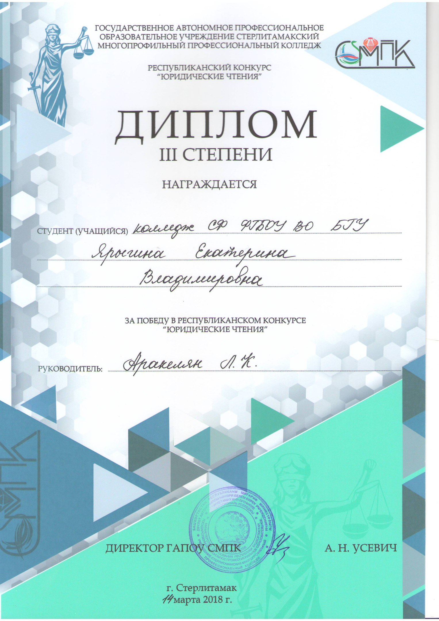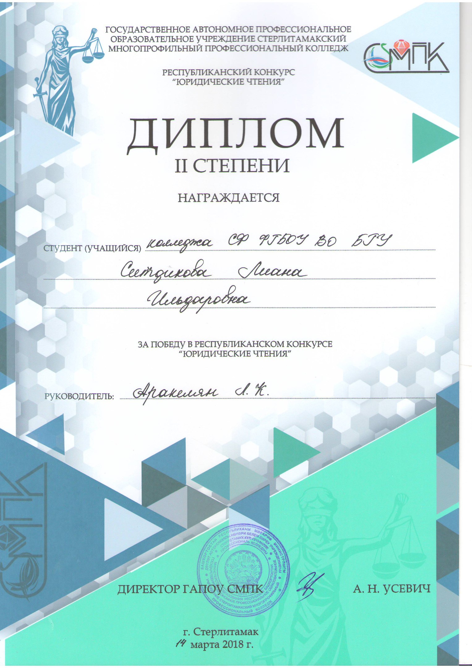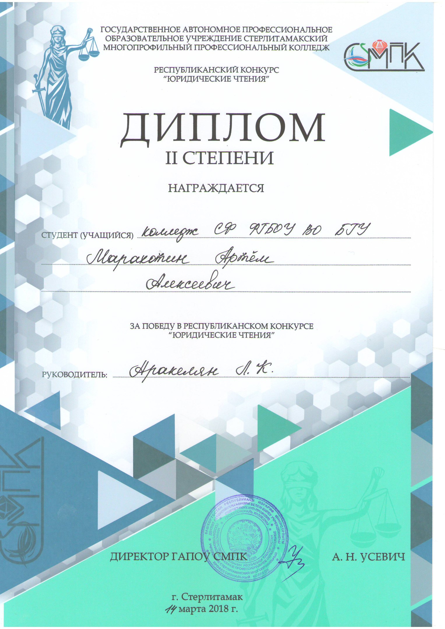 14 марта 2018 года студенты Колледжа Стерлитамакского филиала ФГБОУ ВО «Башкирский государственный университет» под руководством преподавателей юридических дисциплин Аракеляна Левона Кареновича и Талачевой Эльзы Фанилевны приняли участие в Республиканском конкурсе «Юридические чтения», организованном Министерством образования Республики Башкортостан.