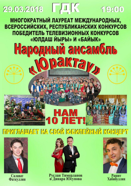29 марта в 19:00 в ГДК многократный лауреат международных, всероссийских, республиканских конкурсов, победитель телевизионных конкурсов Народный ансамбль «Юрактау» приглашает всех желающих на юбилейный концерт.