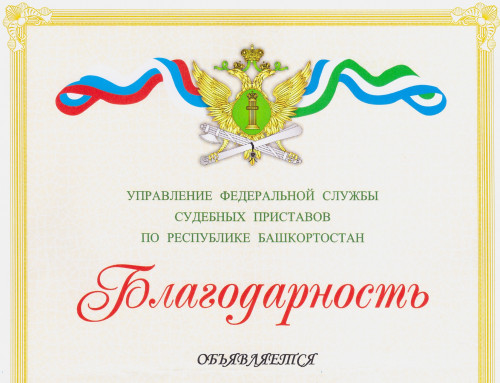 Управление Федеральной службы судебных приставов по Республике Башкортостан выразило признательность и благодарность старшему преподавателю кафедры конституционного и муниципального права юридического факультета СФ БашГУ Суфяновой Елене Зарифовне и студентам 4 курса Валитовой Гульназ Рашитовне (44 группа), Лиховоловой Анастасии Юрьевне (41 группа), Мазитовой Гульнаре Фанисовне (41 группа) и Хисматуллину Сергею Александровичу (41 группа) по итогам участия в конкурсе научных работ, посвященных истории образования, развития и современной деятельности института судебных приставов в России и зарубежных странах. Конкурс проводился в два этапа – с сентября 2017 года по апрель 2018 года в целях раскрытия творческих способностей студенческой молодежи, сохранения интеллектуального потенциала молодых ученых, поддержки и развития интереса новых поколений юристов к проблемам исполнительного производства в России и принудительного исполнения судебных решений в зарубежных странах.