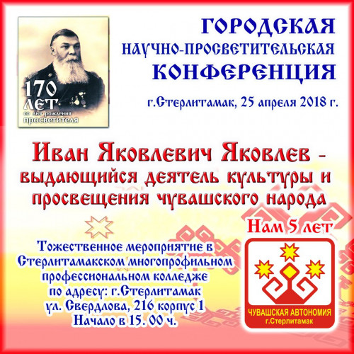 Приглашаем вас принять участие в работе секции „ Педагогическое наследие И.Я. Яковлева в современной системе образования”, посвященной 170-летию со дня рождения чувашского просветителя И.Я. Яковлева, которая состоится 25 апреля 2018 года на базе кафедры татарской и чувашской филологии факультета башкирской и тюркской филологии СФ БашГУ.