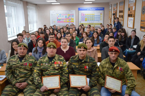 Гостями мероприятия стали спецназовцы: Зимин Александр, Шумаков Алексей, Маняпов Ильдус и Барсуков Денис. Солдаты рассказали о своей жизни до и после своего участия в боевых действиях, поведали множество интересных и поучительных историй, случившихся с ними и их сослуживцами во время службы. Они призывали студентов быть сильными, мужественными, ответственными, а самое главное быть патриотами своей необъятной Родины.