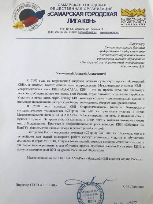 Директор Самарской городской Лиги КВН поблагодарил директора Стерлитамакского филиала Башкирского государственного университета Ковальский А.А. за поддержку команды «Сборной СФ БашГУ» и отметил прогресс и профессиональный рост ее участников.