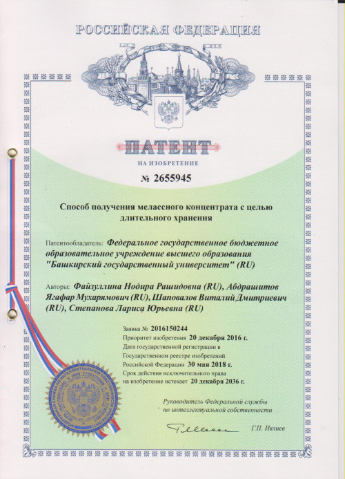 Директорат и деканат естественнонаучного факультета Стерлитамакского филиала Башкирского государственного университета поздравляет коллектив авторов кафедры химии и химической технологии с регистрацией патента на способ получения мелассного концентрата с целью длительного хранения. Данная технология позволяет увеличить срок хранения мелассы, прекратить меланоидиновые реакции, протекающие при хранении.