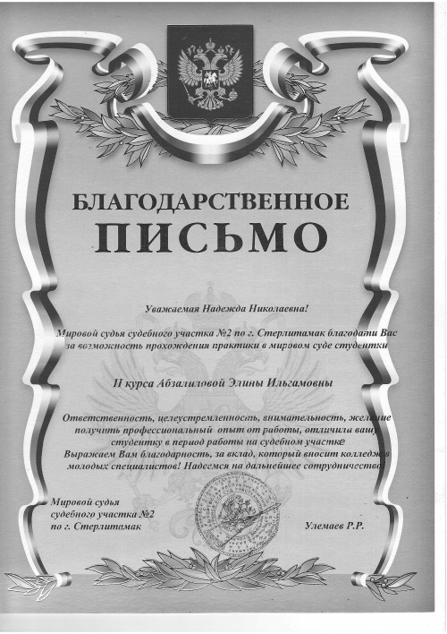 Мировой судья судебного участка №2 наградил студентов специальности "Право и судебное администрирование" благодарственными письмами за успешное прохождение практики!