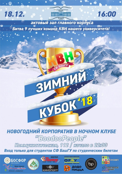 18 декабря 2018 года в актовом зале главного корпуса университета состоится "Зимний кубок КВН СФ БашГУ". В игре примут участие 9 команд: