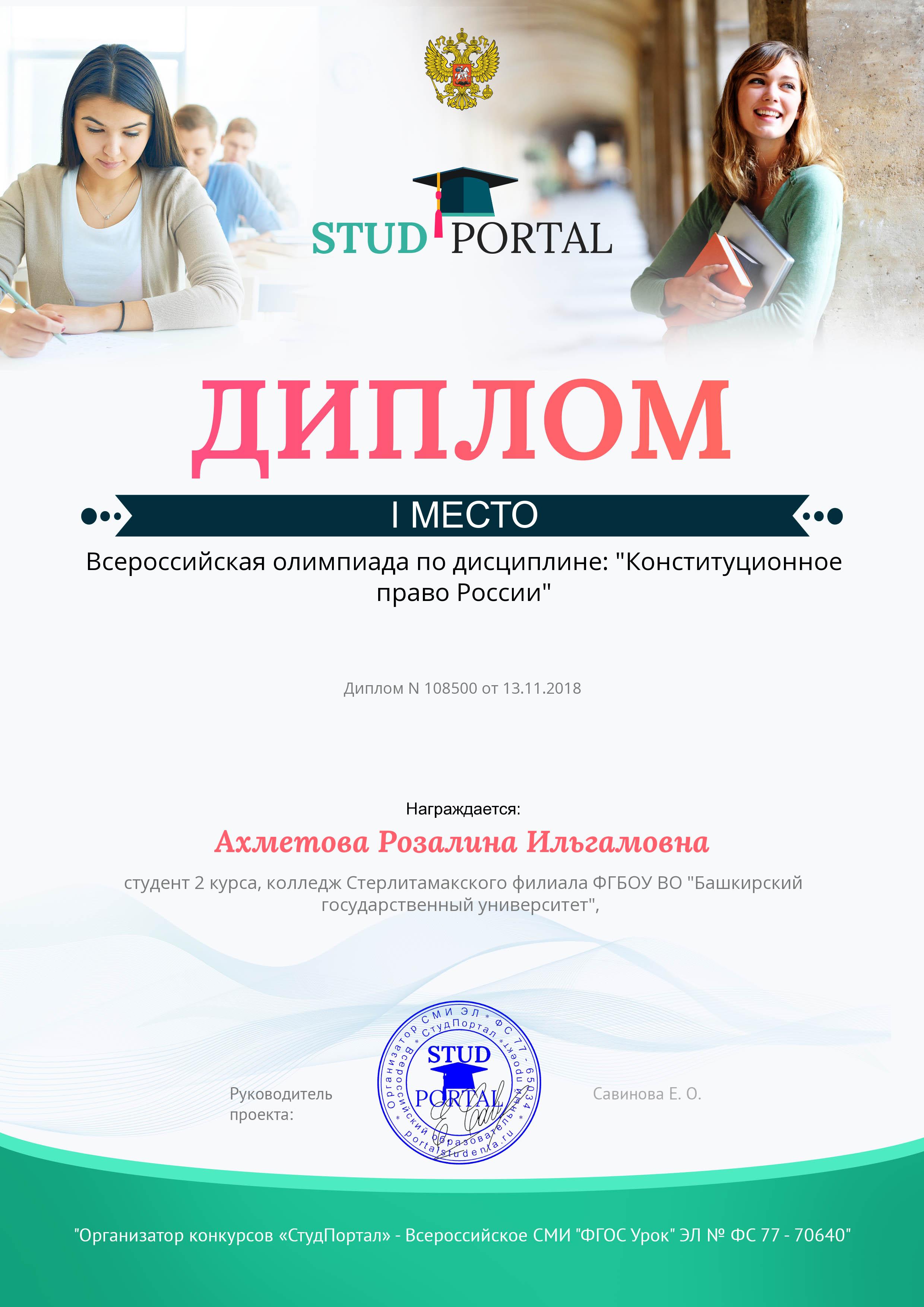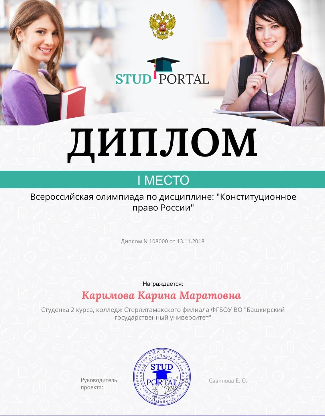 11 ноября 2018 года студенты 2 курса колледжа СФ БашГУ специальности 40.02.01 Право и организация социального обеспечения Ахметова Розалина Ильгамовна и Каримова Карина Маратовна под руководством преподавателя юридических дисциплин Аракеляна Левона Кареновича приняли участие во Всероссийской олимпиаде по дисциплине «Конституционное право России».