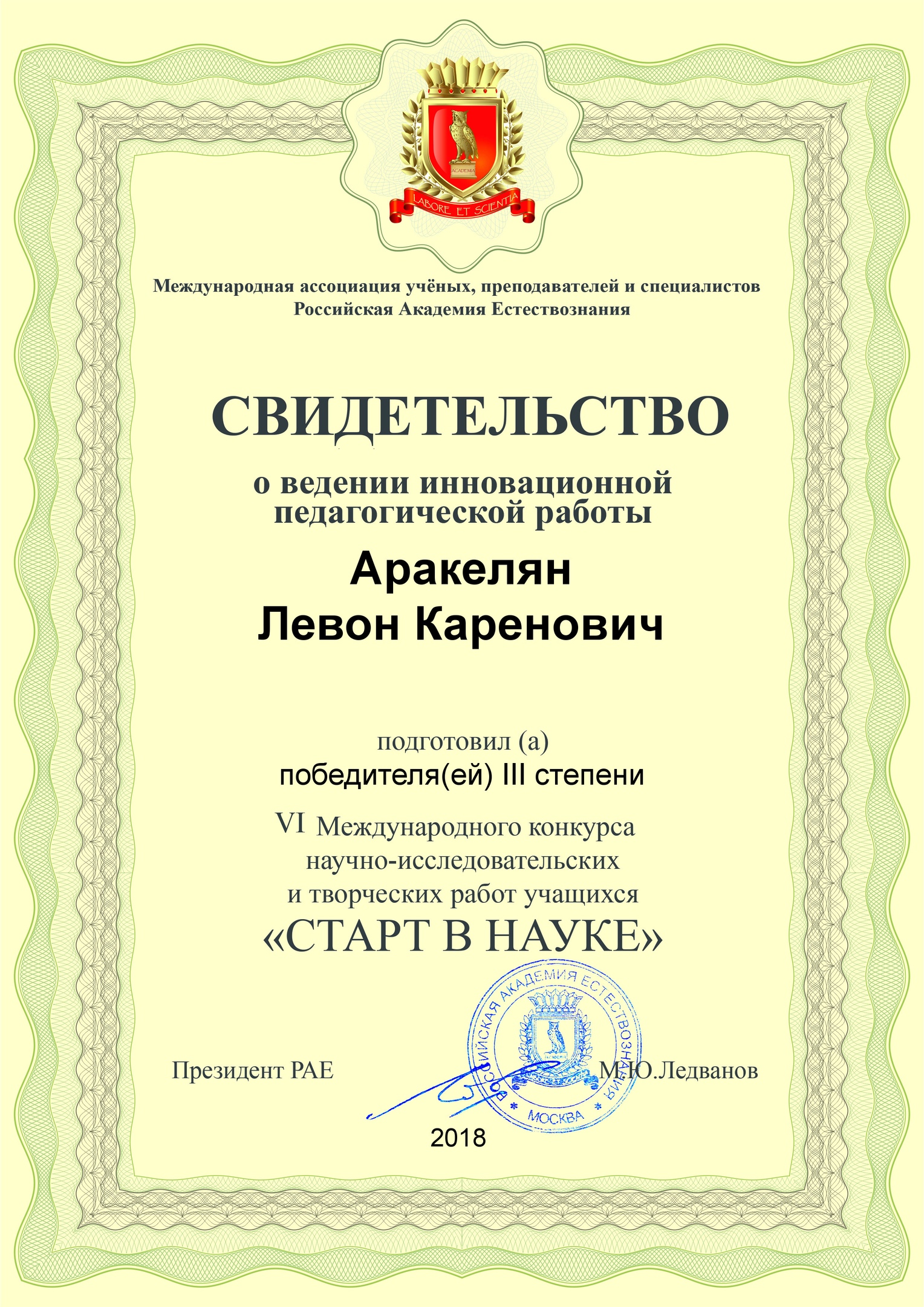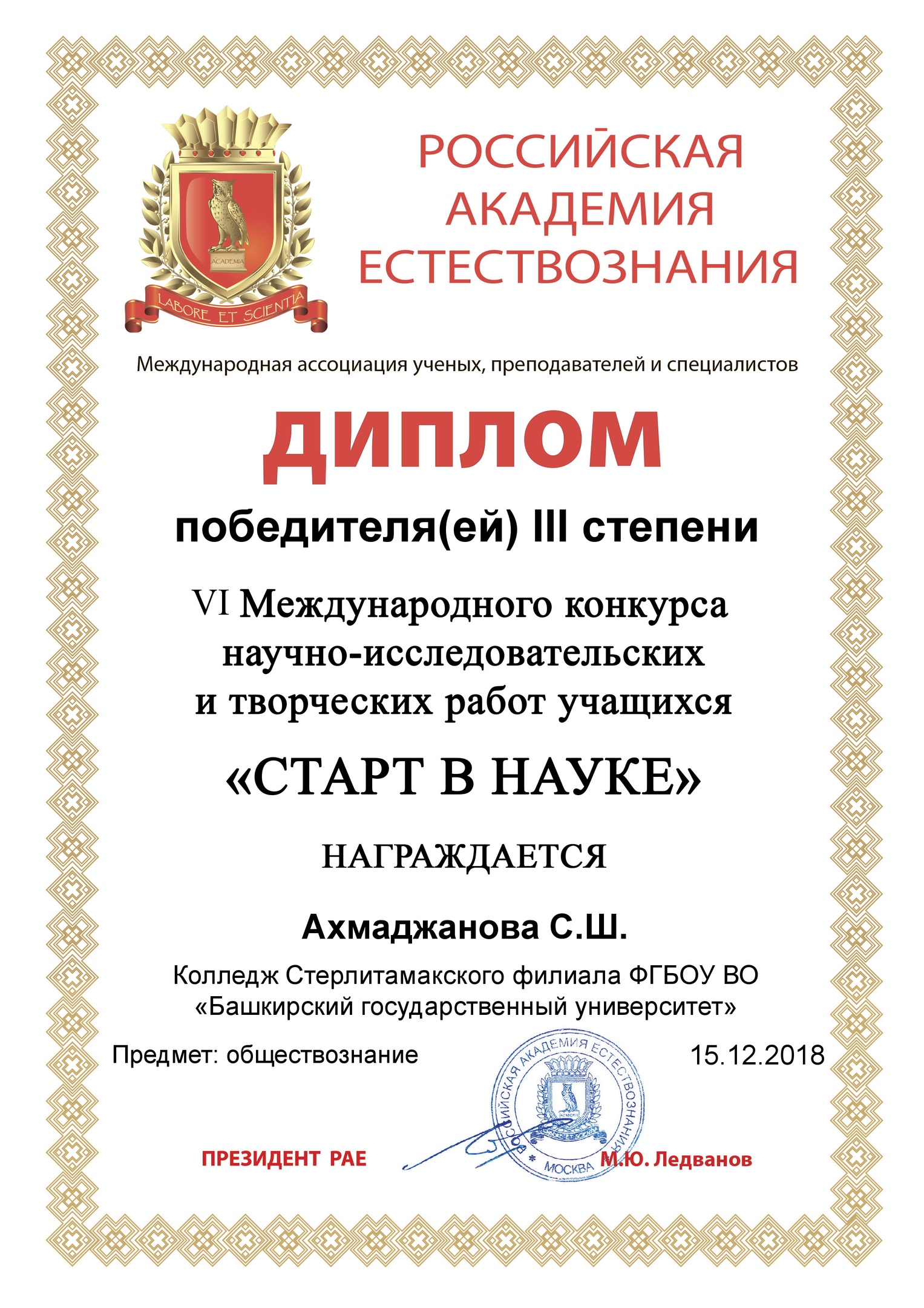 С 01 октября по 30 ноября 2018 года под научным руководством преподавателя юридических дисциплин Аракеляна Левона Кареновича студенты колледжа СФ БашГУ Ахмаджанова Севгинабону Шавкаджоновна и Табабилова Алина Рамилевна приняли активное участие в работе секции «Обществознание» V Международного конкурса научно-исследовательских и творческих работ учащихся «Старт в науке». В работе секции приняли участие 95 учащихся.