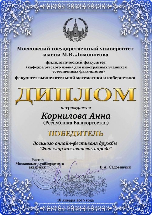 В Московском государственном университете им. М.В. Ломоносова 18 января 2019 года состоялся заключительный этап Восьмого онлайн-фестиваля дружбы «Фольклор как исповедь народа». Онлайн-фестиваль дружбы – ежегодный фестиваль, ставший уже традиционным, идея которого принадлежит ректору Московского университета академику В.А. Садовничему. Участниками Фестиваля в этом году стали 248 студентов, аспирантов, магистрантов, стажеров из 47 университетов – как российских, так и зарубежных. Финалисты Фестиваля родом из более чем 50-ти стран мира – из Китая и Японии, Индии и Монголии, из множества стран Африки, Латинской Америки, Средней и Юго-Восточной Азии, Европы, Ближнего Востока (более подробно о фестивале: http://friendship2018.distant.msu.ru/).