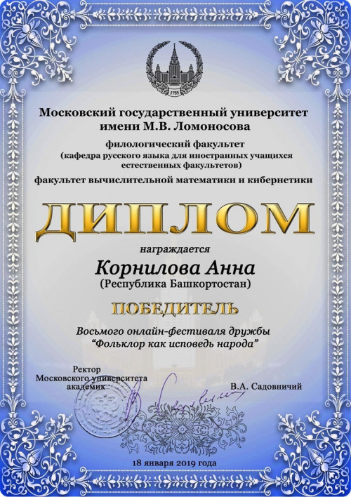 В Московском государственном университете им. М.В. Ломоносова 18 января 2019 года состоялся заключительный этап восьмого онлайн-фестиваля дружбы «Фольклор как исповедь народа». Это ежегодный фестиваль, идея которого принадлежит ректору Московского университета академику В.А. Садовничему.