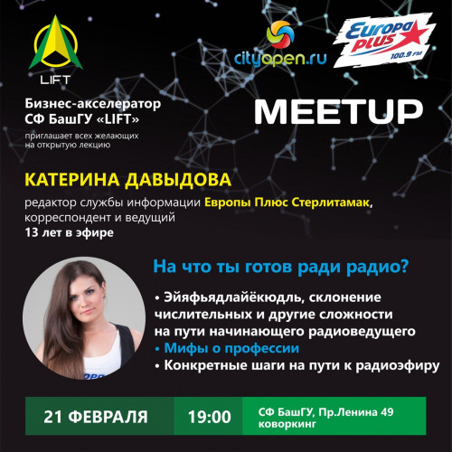 Расскажет Катерина Давыдова, редактор службы информации радиостанции Европа Плюс Стерлитамак, корреспондент и ведущий информационно-развлекательных программ. 13 лет в эфире.