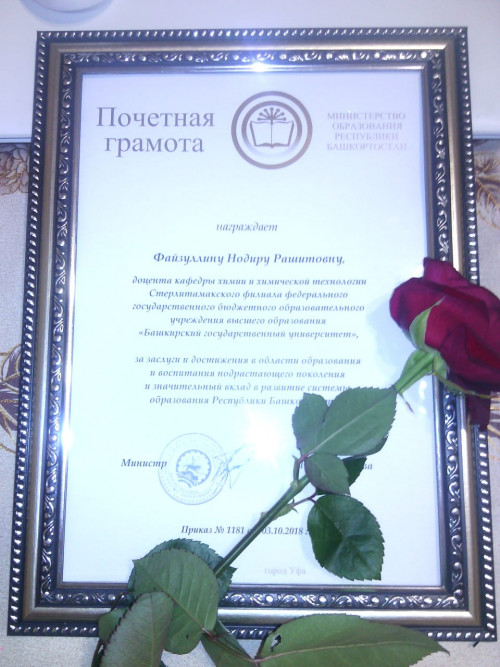 Нодире Рашидовне была вручена Почетная грамота Министерства образования Республики Башкортостан за заслуги и достижения в области образования и воспитания подрастающего поколения и значительный вклад в развитие системы образования Республики Башкортостан.