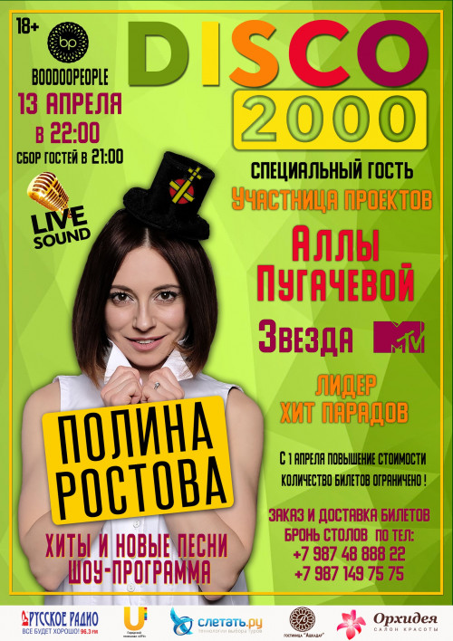 13 апреля 2019 г. в 22.00 в нашем городе участница проектов Аллы Пугачевой, звезда MTV, лидер хит-парадов Полина Ростова с новой шоу-программой Disco-2000 (мьюзик-холл «Boodoopeople»).