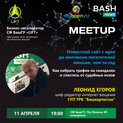 Встреча состоится 11 апреля в 19:00 час. в коворкинге СФ БашГУ (пр. Ленина, 49, правое крыло). Вход свободный, при себе иметь паспорт.