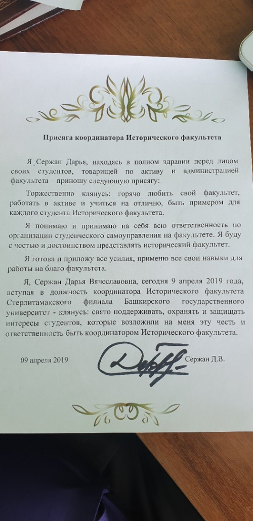 Абсолютным большинством поданных голосов именно она была избрана представителем интересов студентов нашего факультета на ближайший год. На прошедшей сразу же церемонии инаугурации Дарья принесла присягу и пообещала продолжать традиции нашего любимого факультета!