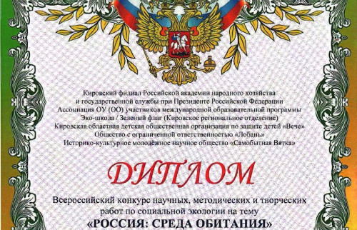 В апреле 2019 г. были подведены итоги III-го Всероссийского (с международным участием) конкурса научных, методических и творческих работ по социальной экологии на тему «Россия: среда обитания». В номинации «Поделка из природного материала» студентка 3 курса группы НО 31 Игинтова Мария Николаевна была награждена дипломом за 1 место; в номинации «Экологический проект» студентка 1 курса группы НДО 11 Симакова Александра Александровна была награждена дипломом за 3 место. Научный руководитель - кандидат педагогических наук, доцент Петрова Татьяна Ивановна.