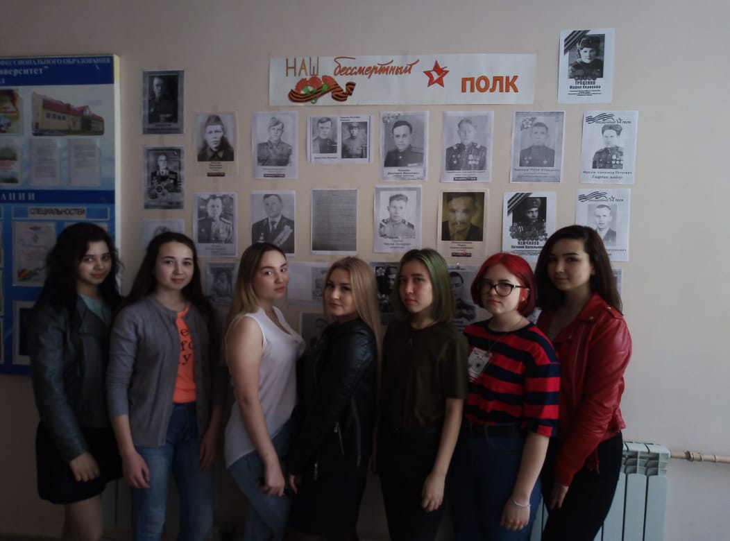 Уже традиционным в колледже стало проведение акции «Наш Бессмертный полк» в канун великого праздника – День Победы. Главная цель акции— сохранить связь поколений и память о наших предках – участниках Великой Отечественной войны, тружениках тыла.