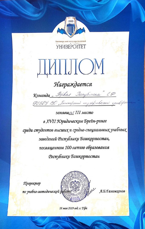 Поздравляем команду студентов юридического факультета СФ БашГУ «ПЕРВАЯ РЕСПУБЛИКА» с 3 местом в Республиканском XVII Юридическом брейн-ринге, посвящённом 100-летию образования Республики Башкортостан!