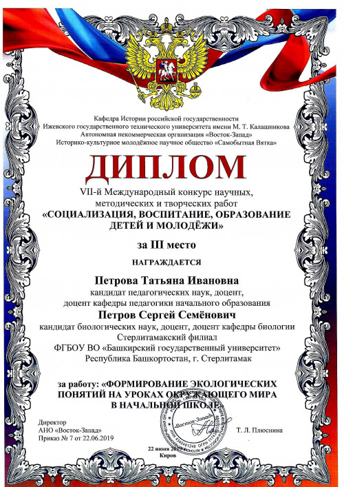 Летом 2019 г. в г. Киров состоялся VII-й Международный конкурс научных, методических и творческих работ «СОЦИАЛИЗАЦИЯ, ВОСПИТАНИЕ, ОБРАЗОВАНИЕ ДЕТЕЙ И МОЛОДЁЖИ». За научную работу «Формирование экологических понятий на уроках окружающего мира в начальной школе» кандидат педагогических наук, доцент кафедры педагогики начального образования Петрова Татьяна Ивановна и кандидат биологических наук, доцент биологии Петров Сергей Семёнович были награждены Дипломом за III место.