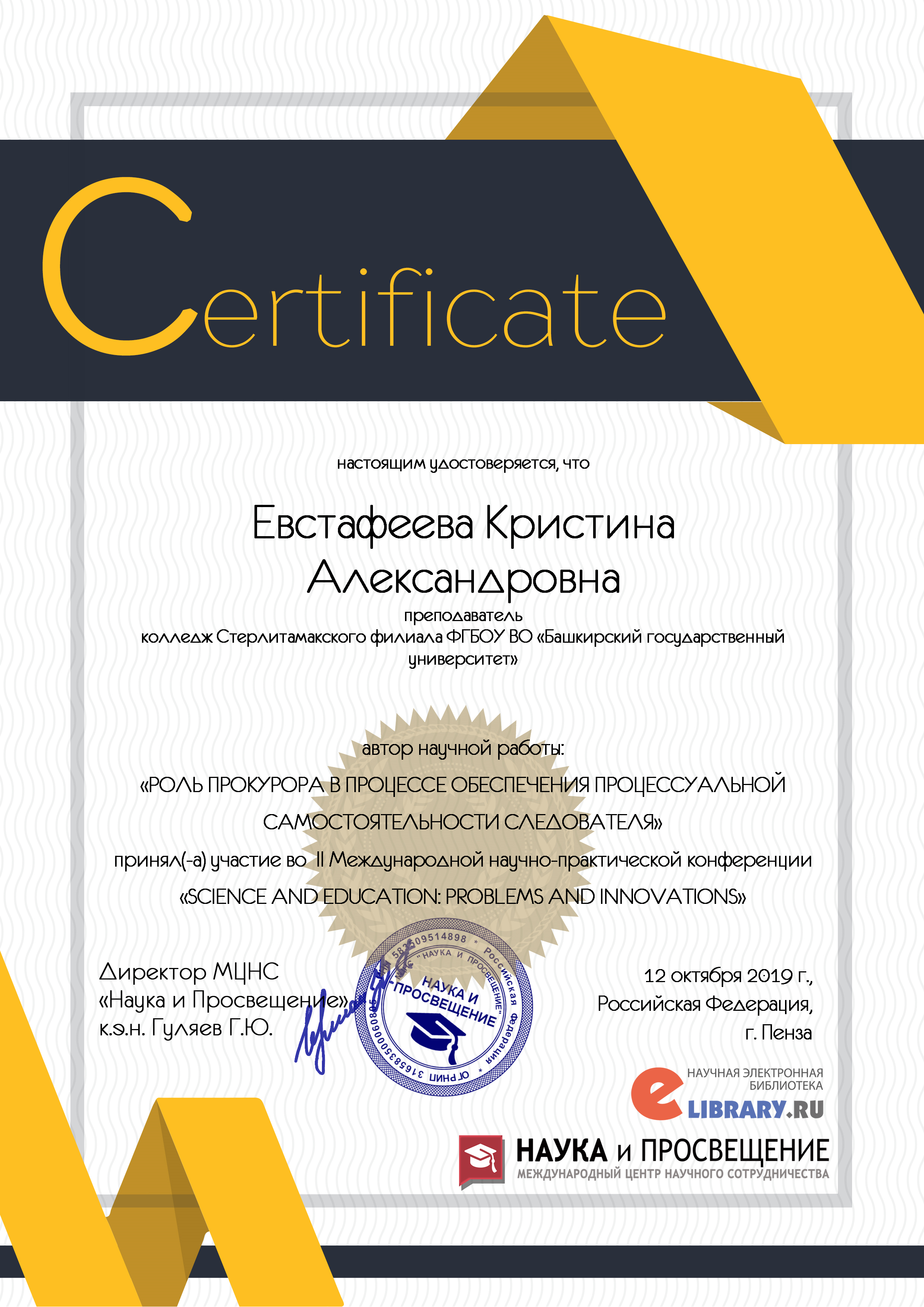 12 октября 2019 года в г. Пенза прошла II Международная научно - практическая конференция SCIENCE AND EDUCATION: PROBLEMS AND INNOVATIONS.