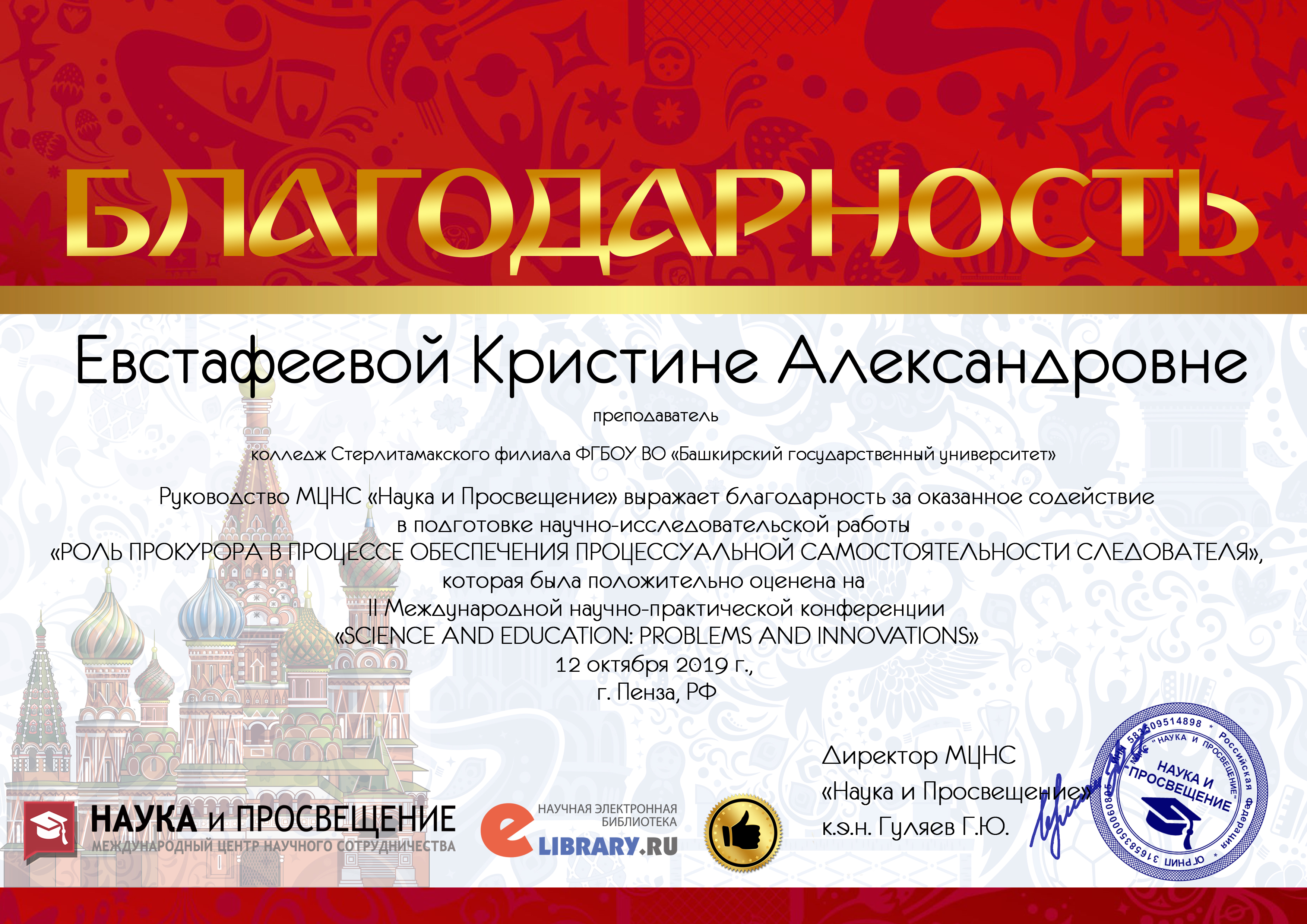 По итогам II Международно научно - практической конференция SCIENCE AND EDUCATION: PROBLEMS AND INNOVATIONS в секции Юридические науки» преподаватель Евстафеева К.А. была награждена благодарственным письмом, сертификатом и дипломом I степени.