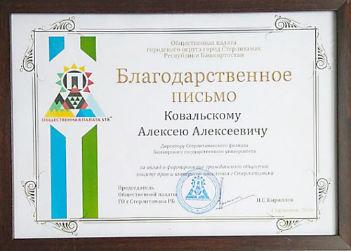 В рамках заседания Общественной палаты директору СФ БашГУ Алексею Алексеевичу Ковальскому вручена благодарность «За вклад в формирование гражданского общества, защиту прав и интересов населения г. Стерлитамака».