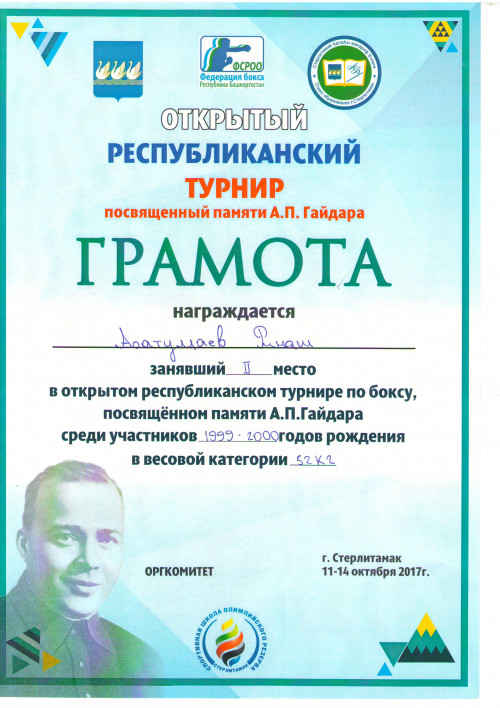 Студент колледжа СФ БашГУ Асатуллаев Ринат Миннуллаевич занял II место среди участников 1999-2000 года рождения в весовой категории 52 кг Открытого республиканского турнира по боксу, посвященному памяти А.П. Гайдара, который проходил с 11 по 14 октября 2017 года в городском округе городе Стерлитамак Республики Башкортостан.