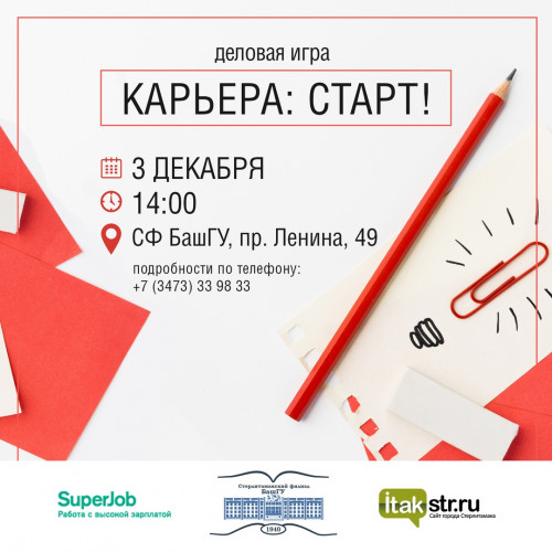 В СФ БашГУ вновь стартует успешный проект «Карьера: Старт!». Всего за один день участники деловой игры смогут спроектировать свой карьерный маршрут и даже апробировать его на практике. Как и в настоящей жизни, участникам предстоит гонка за место на руководящей должности: резюме, собеседование, повышение квалификации, учеба... Чтобы выиграть, необходимо разработать свою стратегию построения карьеры, пройти собеседование у РЕАЛЬНЫХ работодателей – представителей банков, общественных организаций, промышленных компаний юга республики.