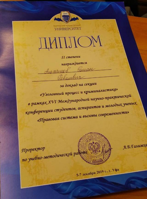 С докладом в работе секции «Уголовный процесс и криминалистика» выступил Альхамов Р.Р. По результатам работы секции он был награжден Дипломом II степени.