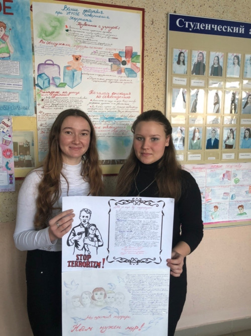 Студенты группы НДО11 факультета педагогики и психологии выпустили стенгазеты под заголовками: «Терроризм – угроза обществу», «Ваши действия при угрозе совершения терракта», «Стоп – терроризм». Затронута актуальная проблема современного общества – угроза возникновения террористических действий. Цель – информационное, организационное просвещение студентов по вопросу профилактики угрозы террористического акта. Плакаты напоминают о бдительности, рассказывают о действиях при угрозе, либо возникновении террористического акта, несут информационно-техническую информацию о методах, которые должны препятствовать его совершению. Стенгазеты подготовили Саитгареева Эльвина, Молчанова Анастасия. Куратор группы Саттарова Л.С.