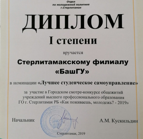 По результатам конкурса общежитие №1 Стерлитамакского филиала СФ БашГУ было удостоено диплома I степени в номинации «Лучшее студенческое самоуправление».