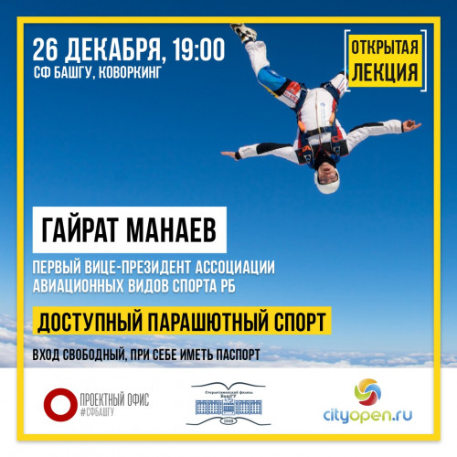 У вас есть возможность стать ближе к своей мечте! 12 февраля гости из федерации парашютного спорта республики проведут лекцию по теории прыжков с парашютом у нас в коворкинге!