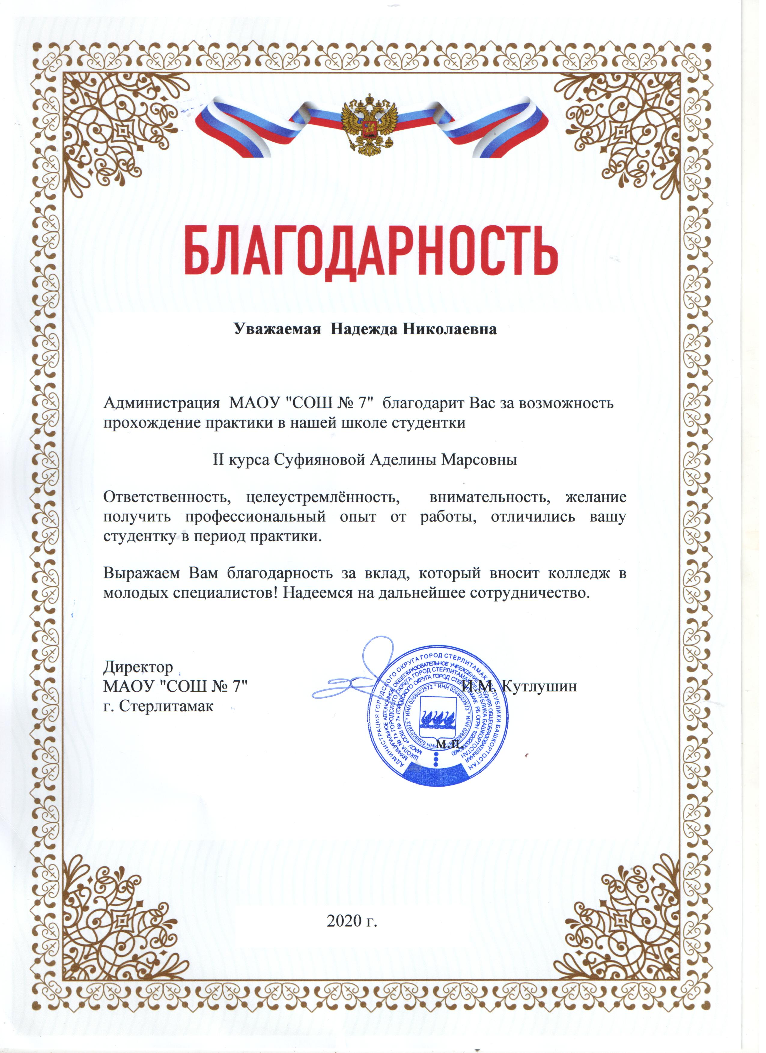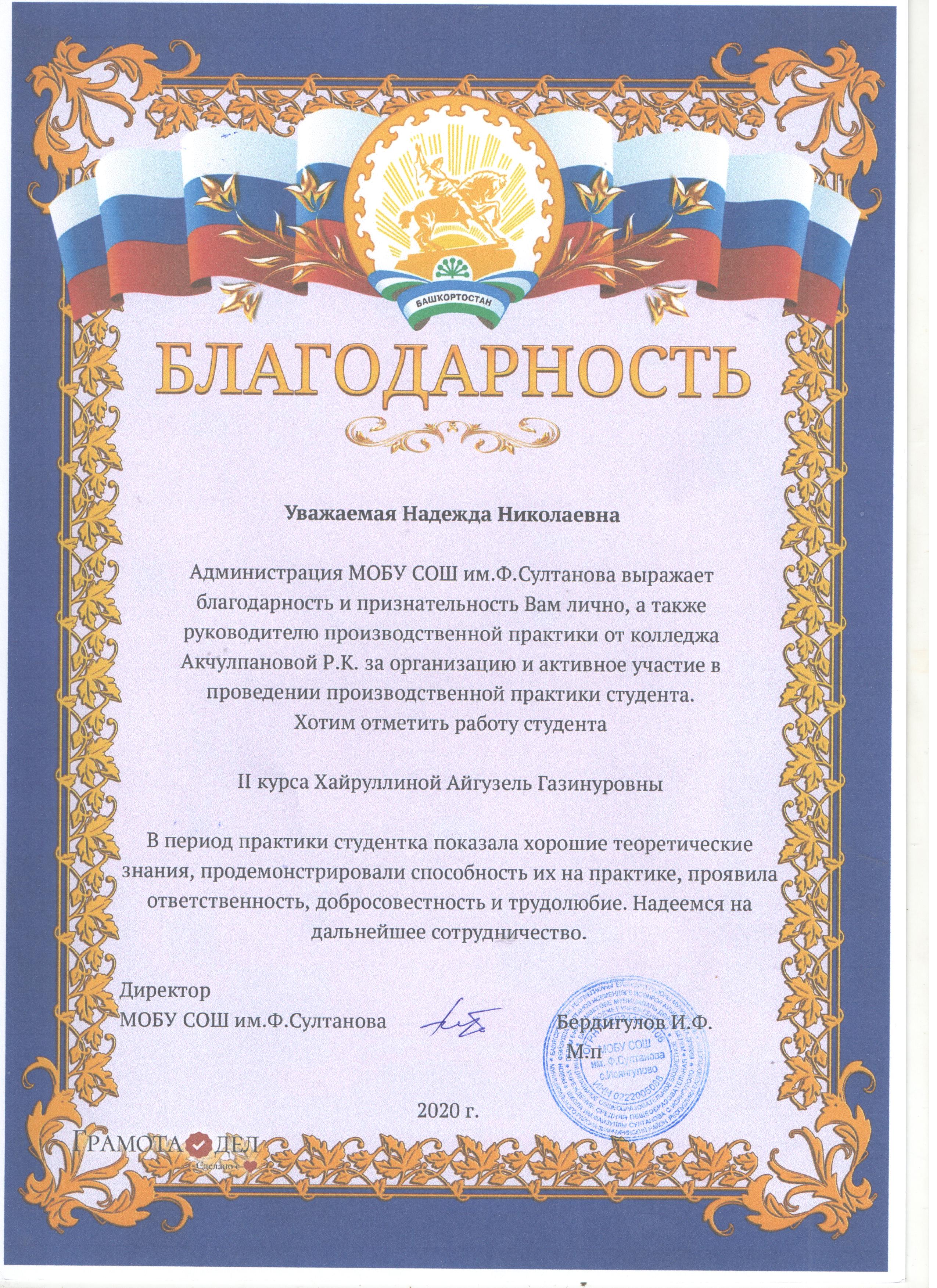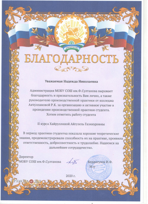 Директора многих школ Республики Башкортостан выражают свою благодарность и признательность заведующему колледжем Надежде Николаевне Ткачевой за отличный уровень подготовки студентов, высокий профессионализм в организации и проведении производственной практики!