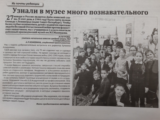 Очень отрадно слышать слова благодарности от руководителей баз практик и читать достижения своих студентов в местных газетах. Так, в газете «Стерлибашевские родники» вышла статья о проведенной экскурсии в рамках внеурочной деятельности студенткой группы 3НО21 Кожевиной Анастасией. Кожевина А.Р.: «Педагогическая практика оказалась для меня удивительно интересной и познавательной, я поняла, что работать с детьми очень непросто, это труд, требующий полной отдачи, любви и уважения».