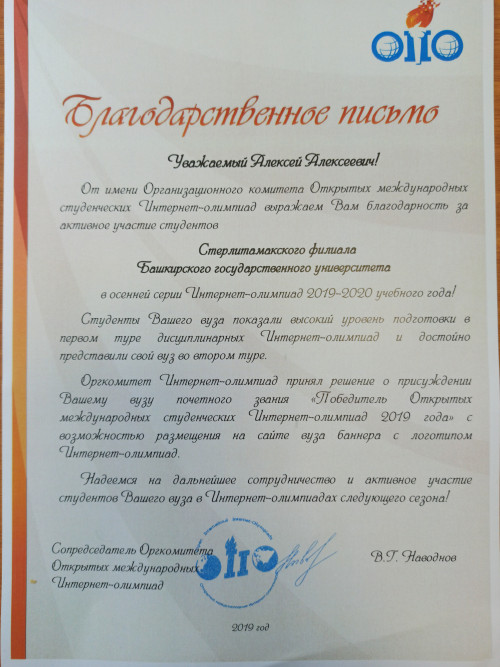Оргкомитет открытых международных Интернет-олимпиад выразил благодарность СФ БашГУ за активное участие студентов в Интернет-олимпиадах 2018-2019 учебного года.