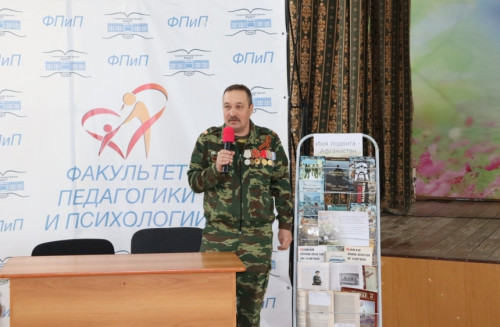 После того как студентка 5 курса Елизавета Соколова прочитала наизусть стихо-творение Дмитрия Самородова «Разведчик со 101-го полка», на сцену был приглашен автор книги «Вокзал 80 – 82. Воспоминания». Минераис Варисович Батталов рассказал об истории создания книги, поделился воспоминаниями о годах службы в Афганистане, ответил на вопросы студентов. Во время рассказа были продемонстрированы слайды, составленные из личных фотографий М.В. Батталова.