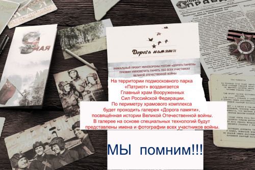 Вокруг Главного храма Вооруженных Сил России, возводимого на территории Военно-патриотического парка культуры и отдыха Вооруженных Сил Российской Федерации «Патриот», для увековечивания памяти об участниках Великой Отечественной войны 1941-1945 годов создается архитектурный ансамбль галерейного типа «Мультимедийный музейный комплекс «Дорога Памяти».