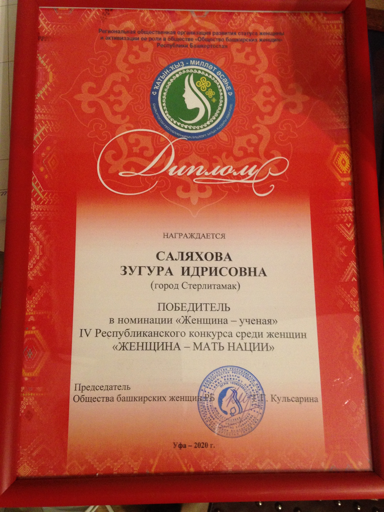 4 марта в конгресс-холле "Торатау" прошел IV Республиканский конкурс "Женщина - мать нации / Ҡатын-ҡыҙ - милләт әсәһе". В конкурсе по 10 номинациям: «Женщина — мать», «Женщина – лидер», «Женщина — ученая», «Женщина — педагог», «Женщина — бизнес-леди», «Женщина — мастер», «Женщина — пример года», «Активная общественница старшего поколения», «Молодой общественный деятель», «Женщина в культуре» соревновались свыше 500 женщин. Доктор филологических наук, заведующий кафедрой башкирской филологии СФ БашГУ Зугура Идрисовна Саляхова одержала победу в номинации "Женщина - ученая"/Ҡатын-ҡыҙ - ғалимә".