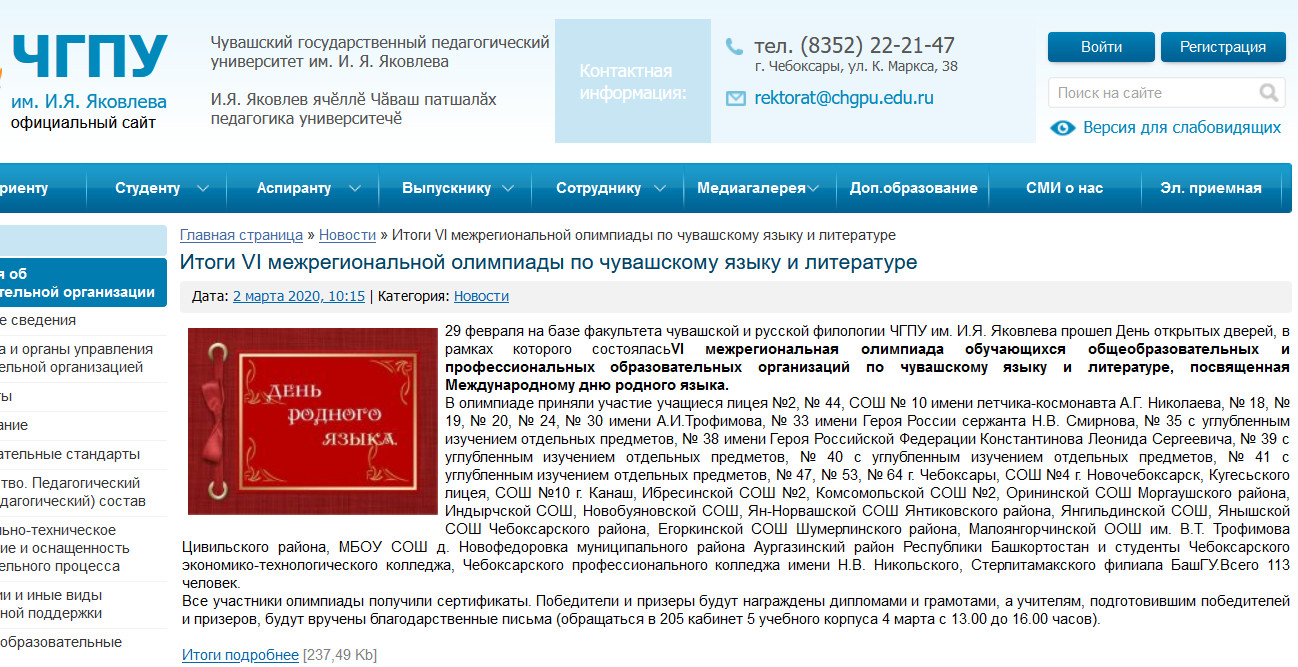 29 февраля 2020 года на базе факультета чувашской и русской филологии ЧГПУ им. И.Я. Яковлева (г. Чебоксары) прошла Межрегиональная олимпиада обучающихся общеобразовательных и образовательных организаций по чувашскому языку и литературе, посвященная Международному дню родного языка. Олимпиада проводилась в целях создания благоприятных условий для развития молодежи и выбора направлений профессионального образования.