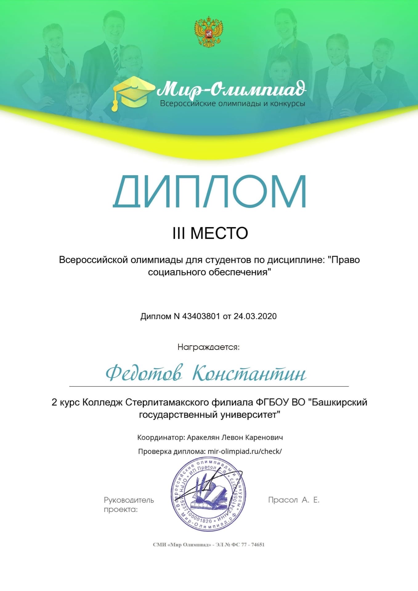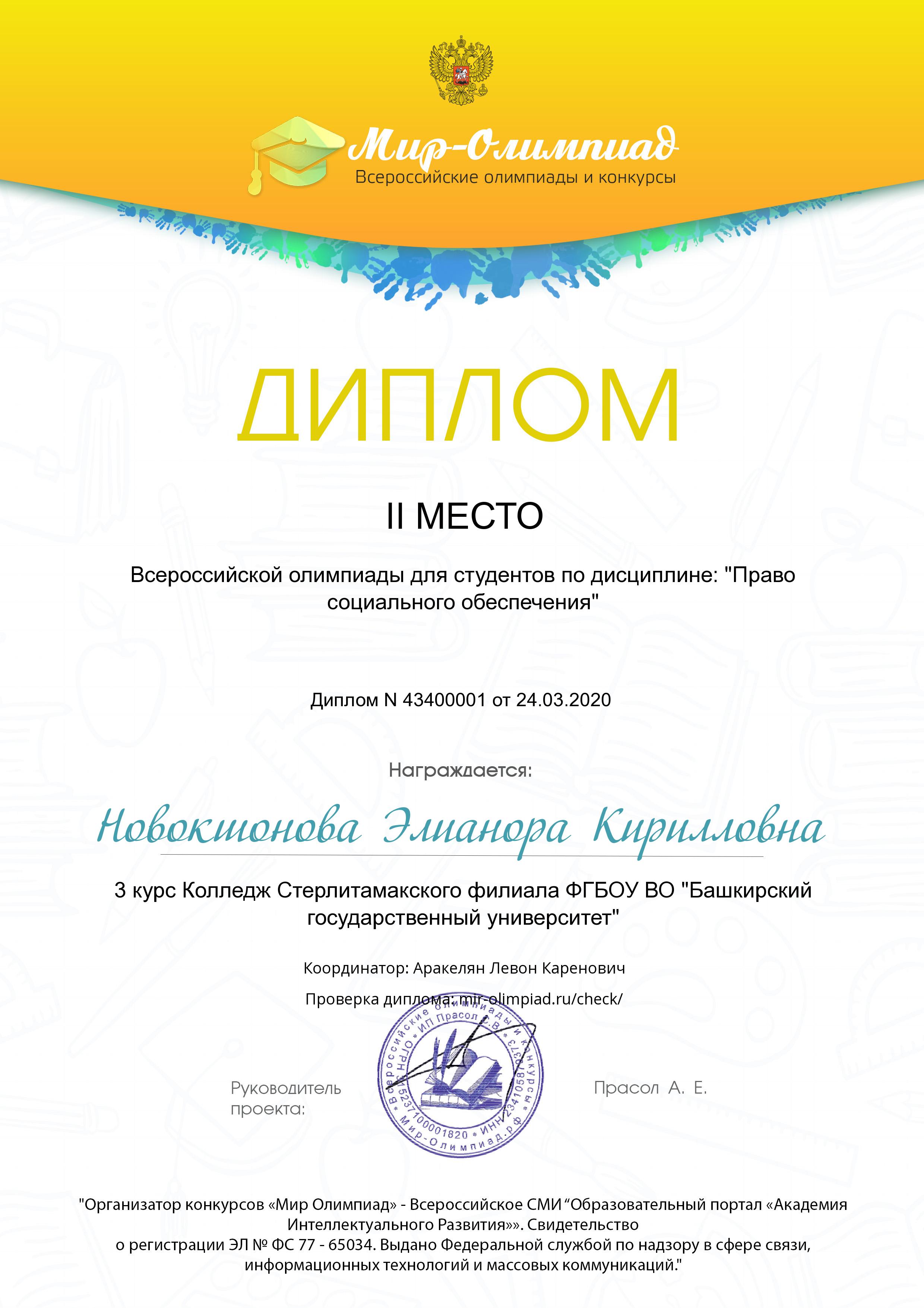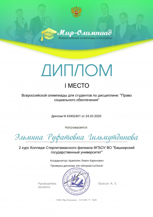 24 марта 2020 года под руководством преподавателя юридических дисциплин Аракеляна Левона Кареновича студенты колледжа СФ БашГУ II и III курсов специальности 40.02.01 Право и организация социального обеспечения приняли участие во Всероссийской олимпиаде по дисциплине «Право социального обеспечения».