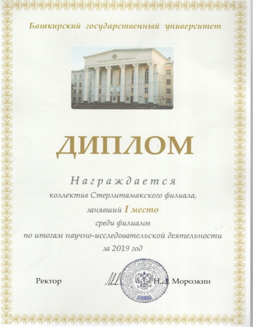 Стерлитамакский филиал Башкирского государственного университета награжден дипломом за первое место среди филиалов университета по итогам научной работы за 2019 г.!