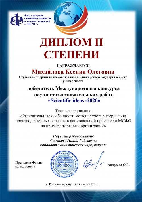 С 01.04.2020 по 30.04.2020 в городе Ростов-на-Дону прошел Международный конкурс научно-исследовательских работ студентов и молодых ученых «Scientific ideas – 2020». Конкурс проходил в два этапа в заочной форме.