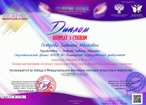 За картину из шерсти «Клубника в вазе» она награждена дипломом «Лауреат 3 степени».