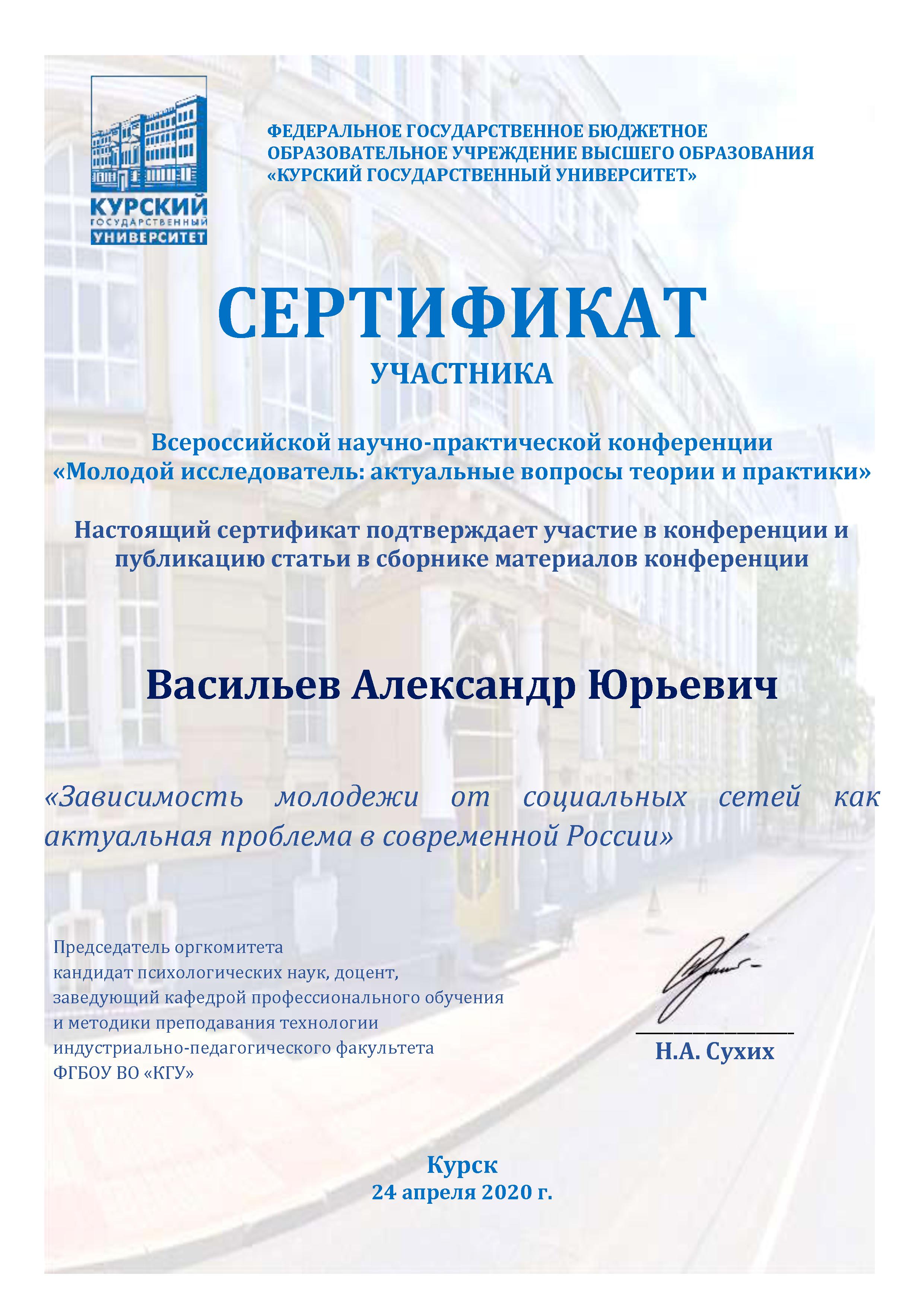 Студент 1 курса колледжа СФ БашГУ специальности 40.02.01 Право и организация социального обеспечения Васильев Александр Юрьевич под руководством преподавателя Аракеляна Левона Кареновича выступил во Всероссийской научно-практической конференции «Молодой исследователь: актуальные вопросы теории и практики», организованной ФГБОУ ВО «Курский государственный университет» с докладом «Зависимость молодежи от социальных сетей как актуальная проблема в современной России».