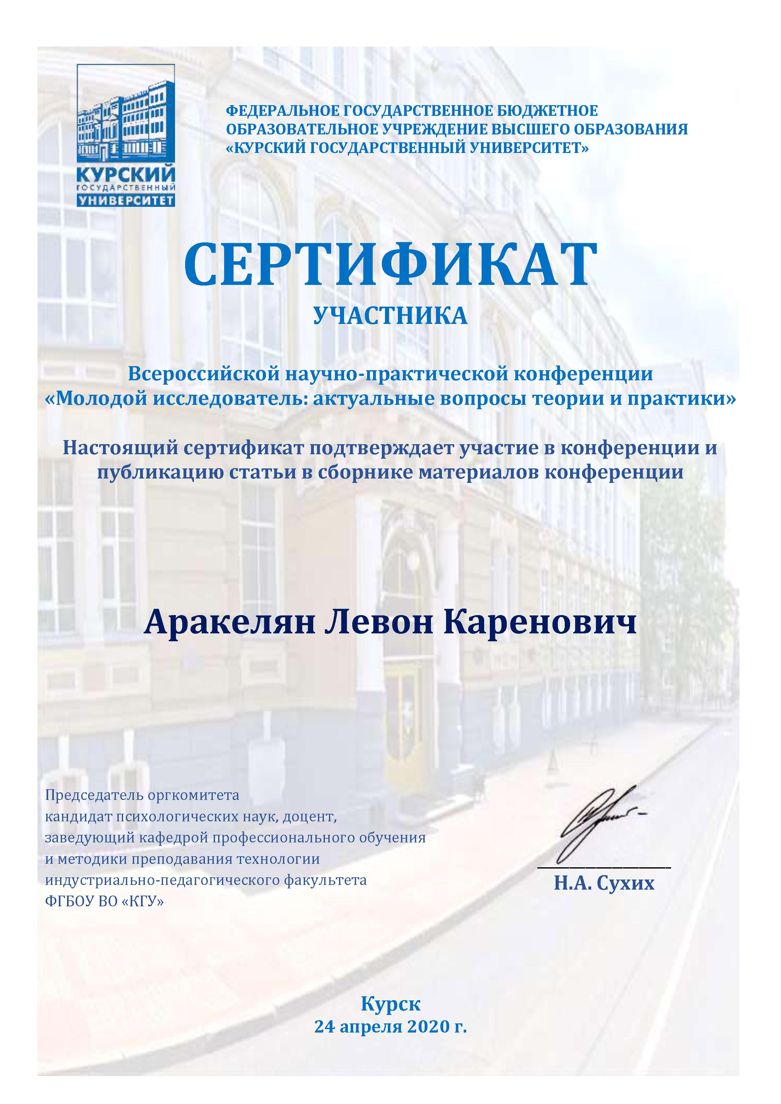 По итогам Всероссийской конференции студент колледжа СФ БашГУ награжден сертификатом участника.