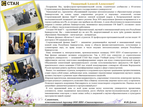 Поздравление с 80-летним юбилеем вуза от стратегического партнера СФ БашГУ, исполнительного директора ООО НПО «Станкостроение» Дудкина Федора Юрьевича.