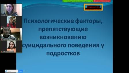 В ходе беседы студенты обсудили факторы склонности подростков к суициду, а также возможности предотвращения суицидальных тенденций со стороны значимых взрослых. Были проанализированы варианты просвещения родителей подростков по данному вопросу. Участники провели также самодиагностику по методике «Экспресс-оценка гармоничности жизненных сфер человека», которая может быть использована для исследования круга интересов подростка, степени насыщенности его жизни.